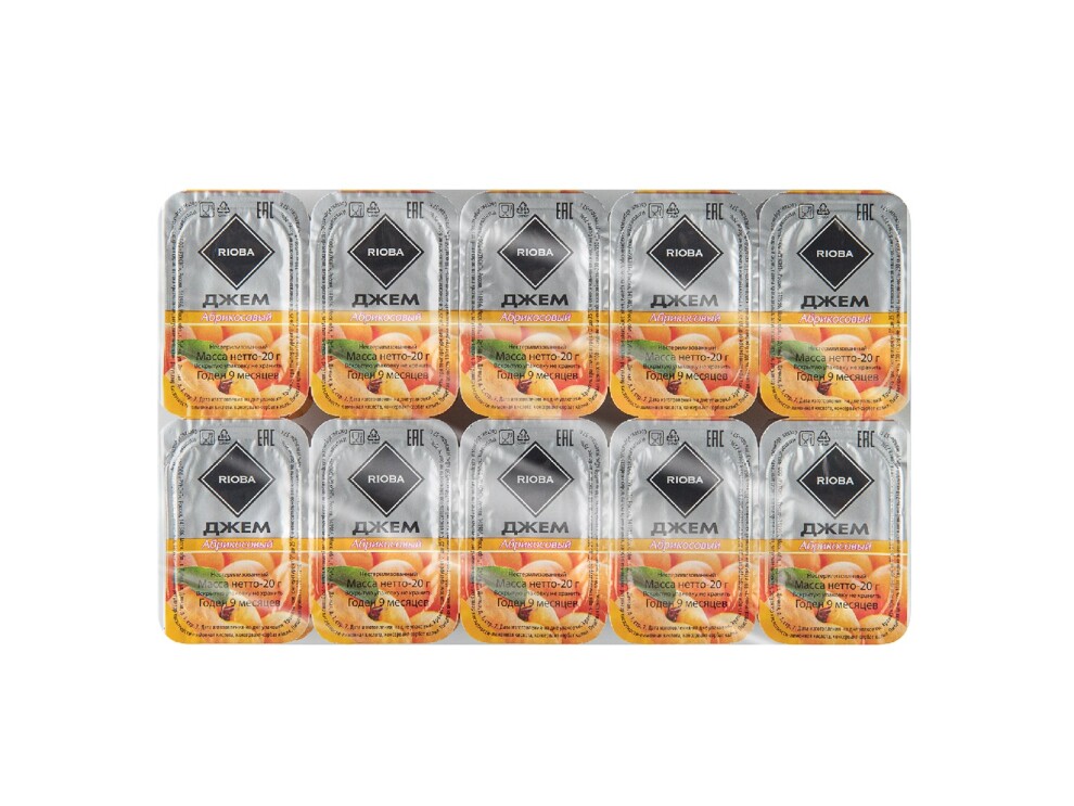 Джем порционный "Rioba" абрикос (Россия). Упаковка - пластины с 20 ячейками по 20 г.
