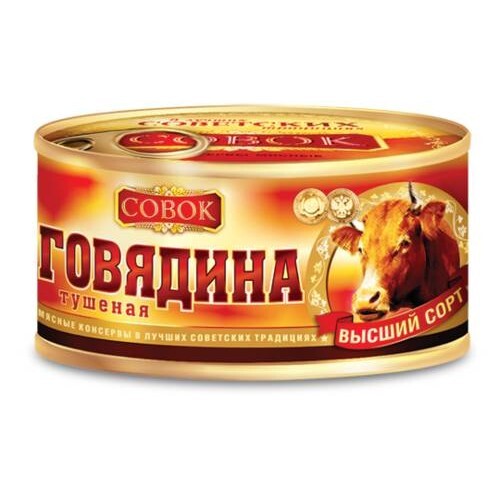 Говядина тушеная"Совок" ГОСТ (Россия). Упаковка - жестяная банка 325 г. Продается упаковками по 36 штук.