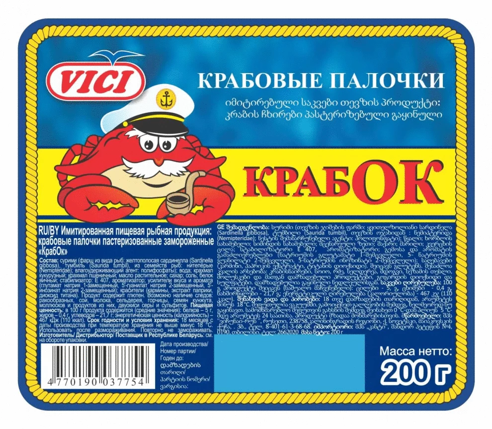 Крабовые палочки КрабОК "Vici" (Россия), замороженные. Упаковка 200 г.