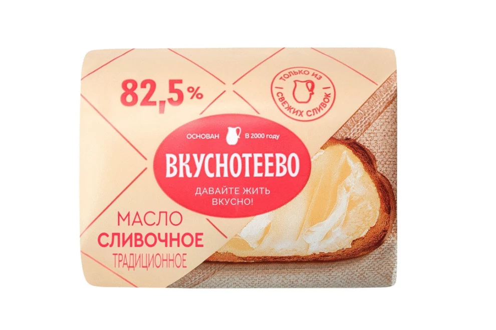 Масло сладко-сливочное "Вкуснотеево" 82,5% жирности (Россия). Упаковка - пергамент 180 г.
