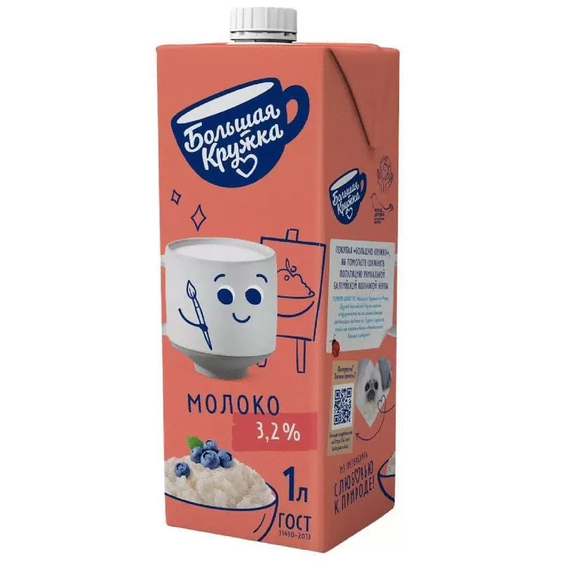 Молоко "Большая кружка" 3,2% жирности. Упаковка - тетрапак 0,98 л.