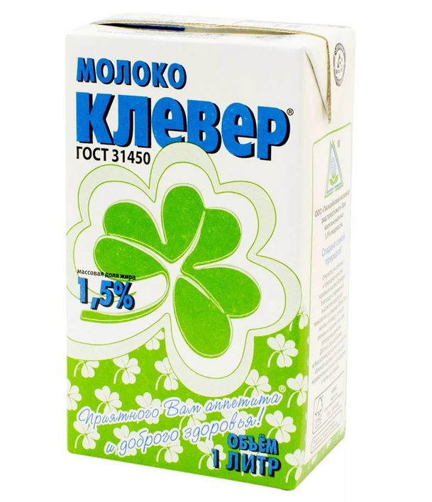 Молоко "Клевер" 1,5% жирности. Упаковка - тетрапак 1 л.