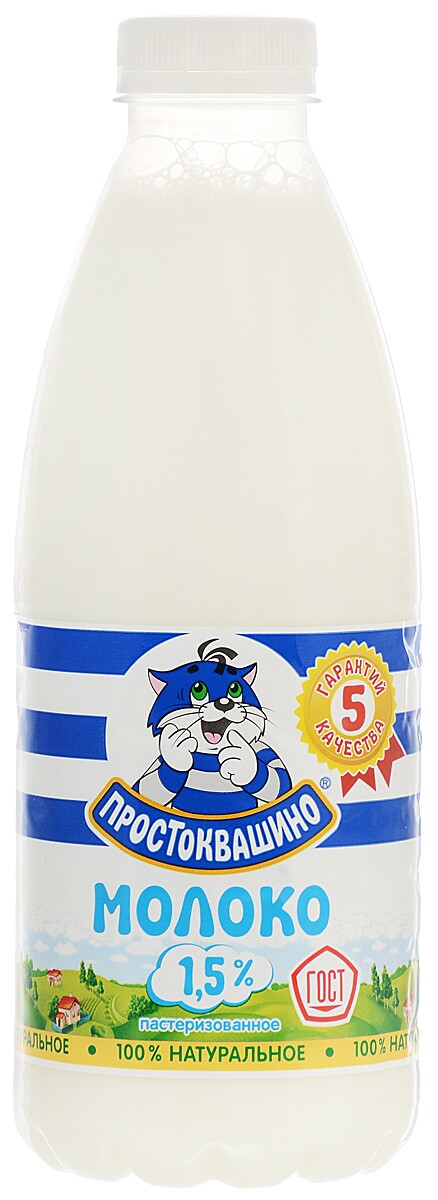 Молоко "Простоквашино" 1,5% жирности, пастеризованное. Упаковка - пластиковая бутылка 0,93 л.