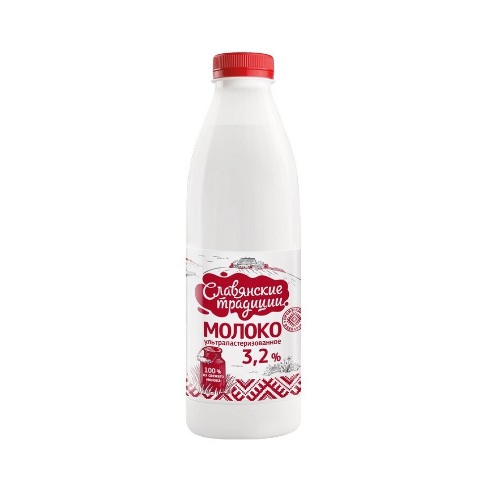 Молоко "Славянские традиции" 3,2% жирности. Упаковка - пластиковая бутылка 900 мл.