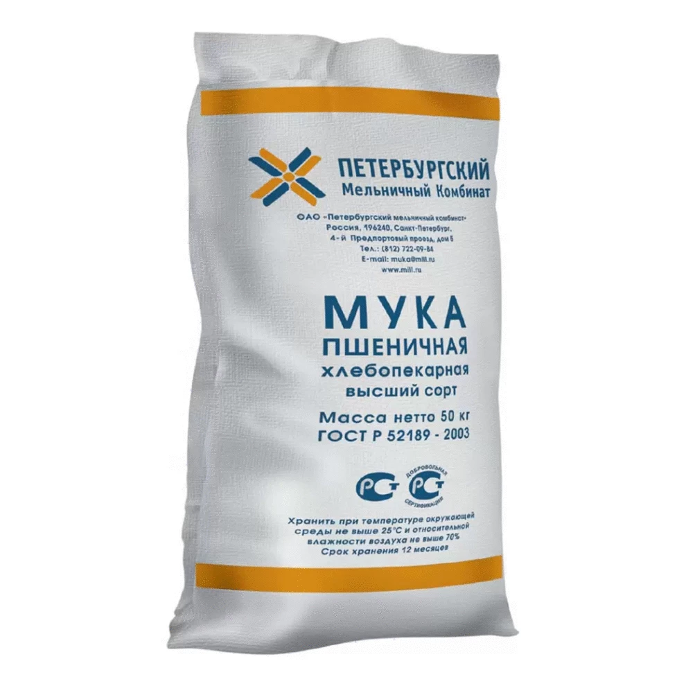 Мука пшеничная "Предпортовая" производства ОАО "Петербургский мельничный комбинат". Упаковка - мешок 50 кг.