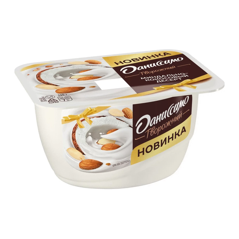 Продукт творожный "Даниссимо" Кокосово-миндальный десерт 6,8% жирности. Упаковка - пластиковая ванночка 130 г.