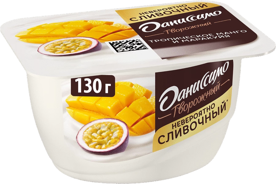 Продукт творожный "Даниссимо" Тропическое манго и маракуйя 5,6% жирности. Упаковка - пластиковая ванночка 130 г.
