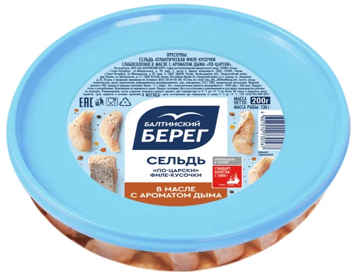 Сельдь По-царски "БАЛТИЙСКИЙ БЕРЕГ" филе-кусочки в масле с ароматом дыма (200 г)