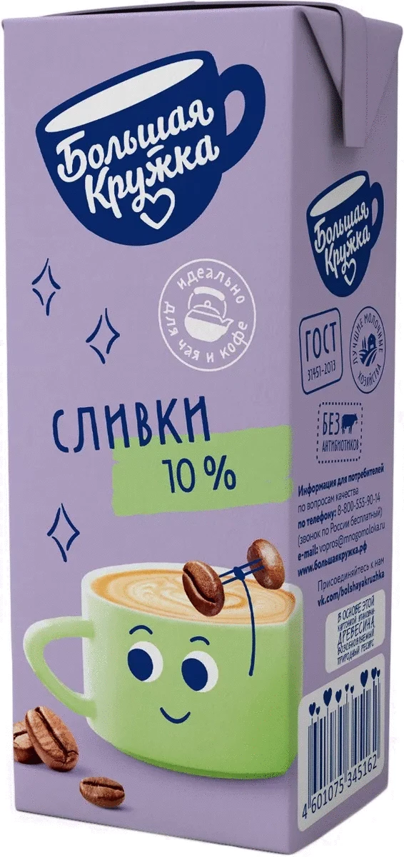Сливки "Большая Кружка" 10% жирности. Упаковка - тетрапак 0,2 л.