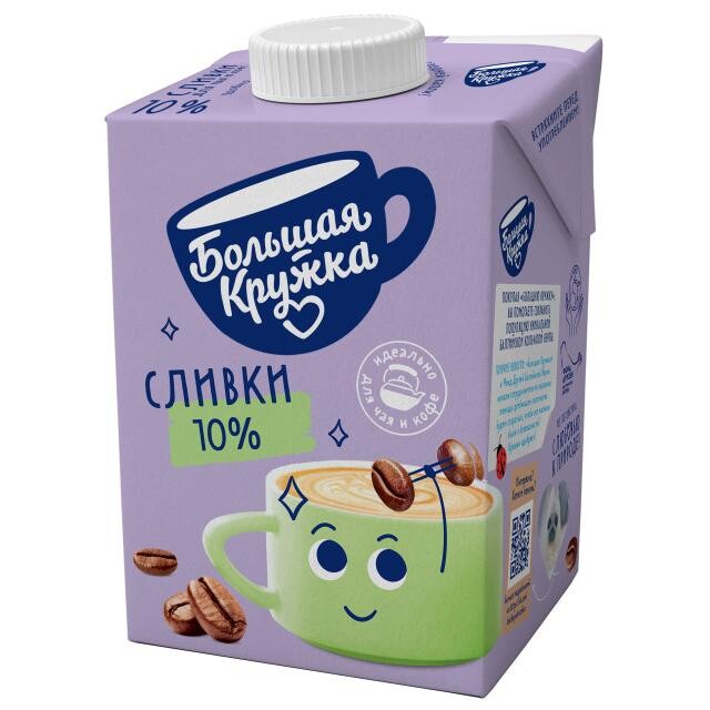 Сливки "Большая Кружка" 10% жирности. Упаковка - тетрапак 500 г.