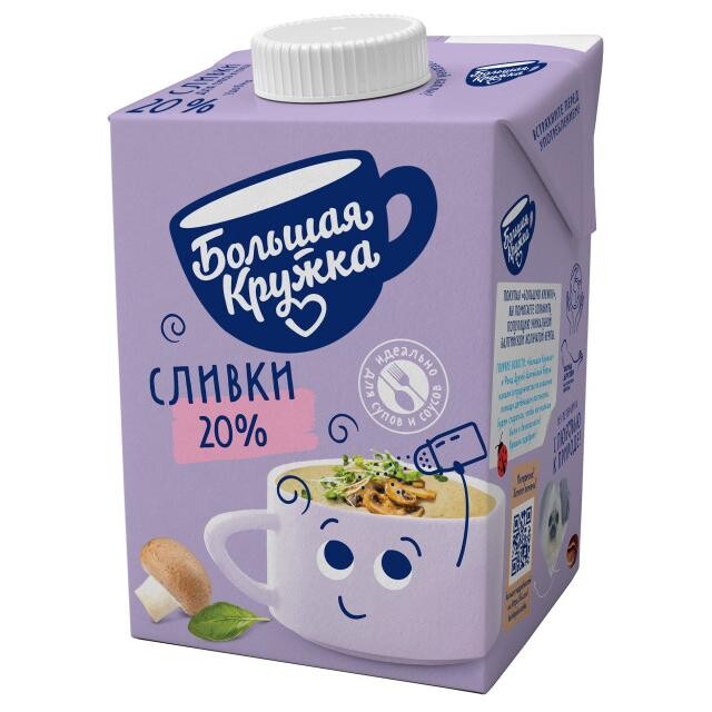 Сливки "Большая Кружка" 20% жирности. Упаковка - тетрапак 500 г.