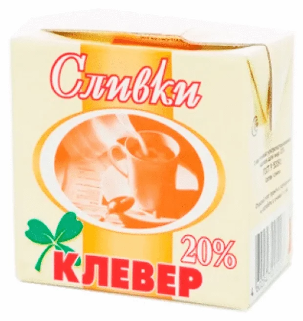 Сливки "Клевер" 20% жирности. Упаковка - тетрапак 0,5 л.