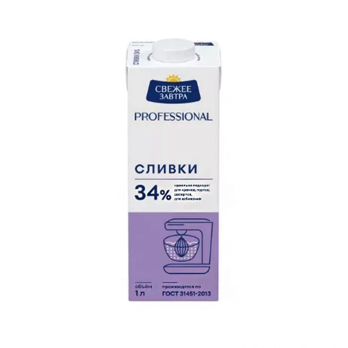 Сливки "Свежее завтра" 34% жирности. Упаковка - тетрапак 1 л.