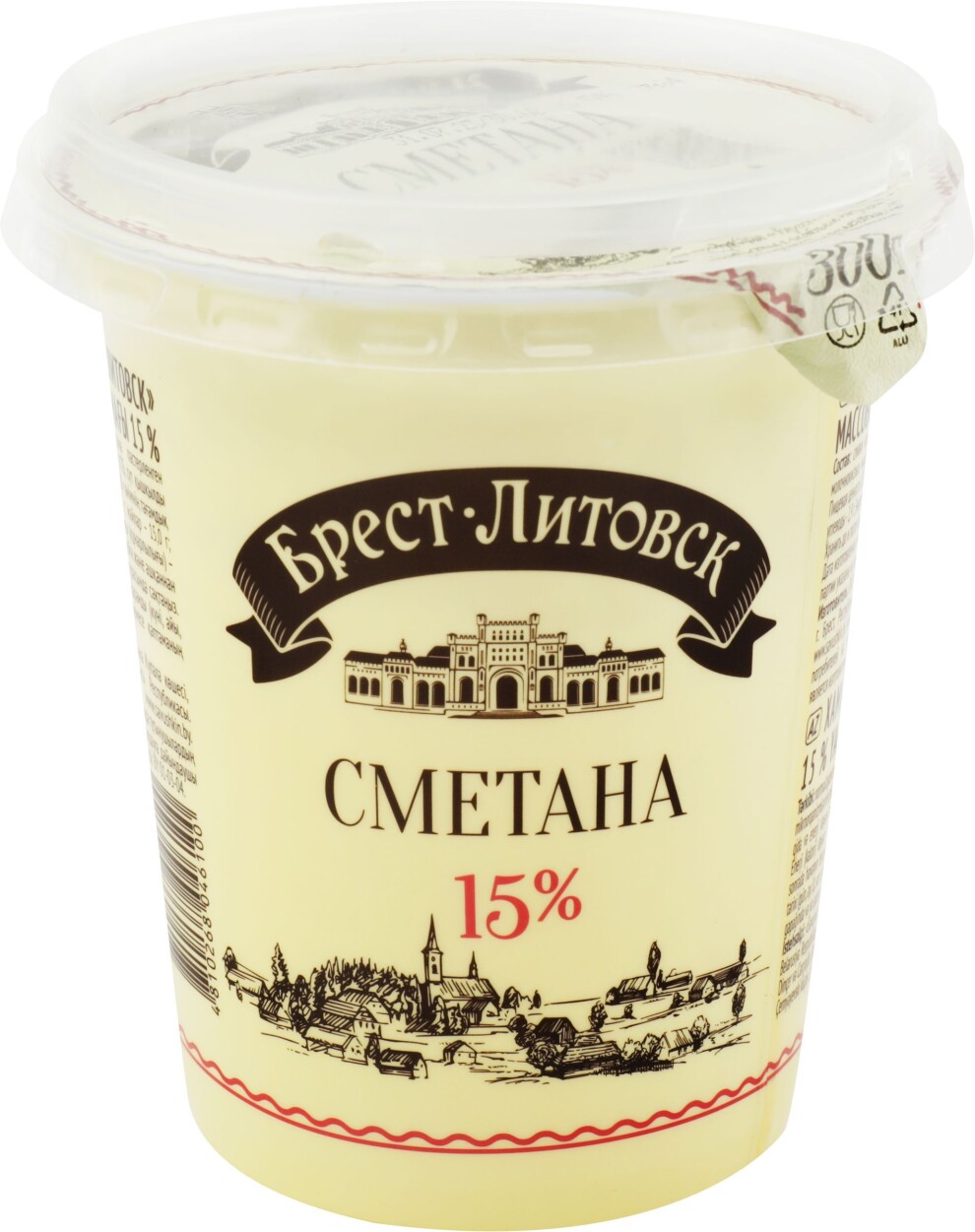 Сметана "Брест-Литовск" 15% жирности (Белоруссия). Упаковка - пластиковый стакан 300 г.