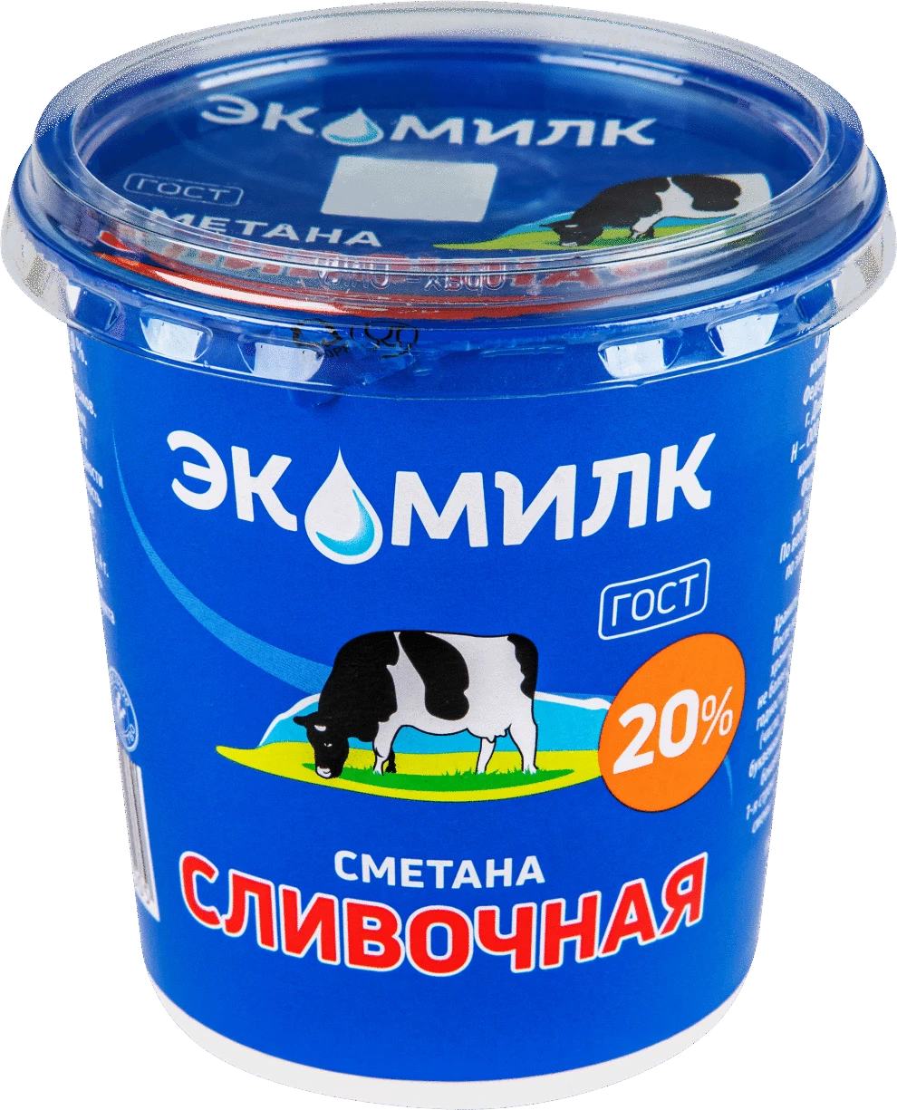 Сметана "Экомилк" 20% жирности (Россия). Упаковка - пластиковый стакан 300 г.