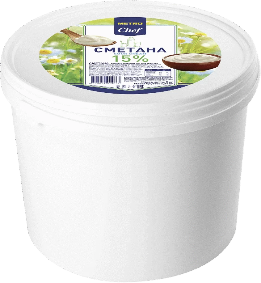 Сметана Metro Chef 15% жирности (Россия). Упаковка - пластиковое ведерко 5 кг..