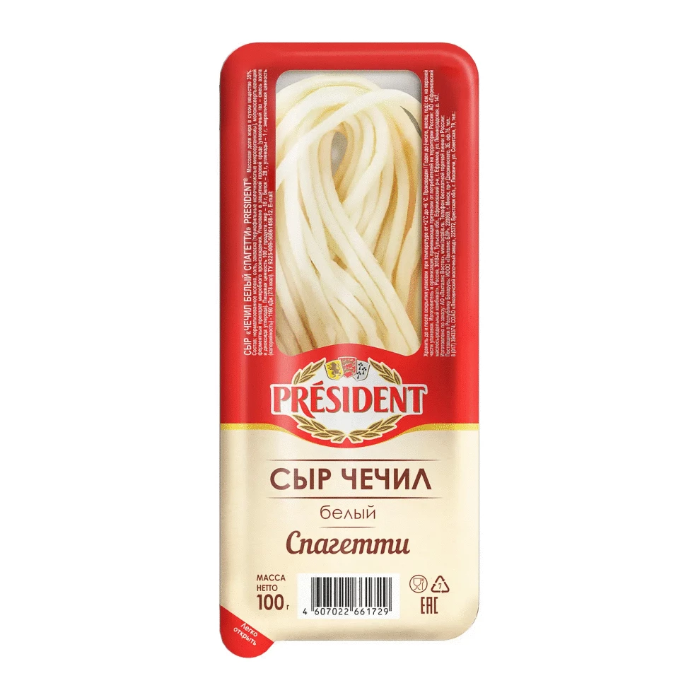 Сыр Чечил "President" спагетти 35% жирности (Россия). Упаковка - 100 г.