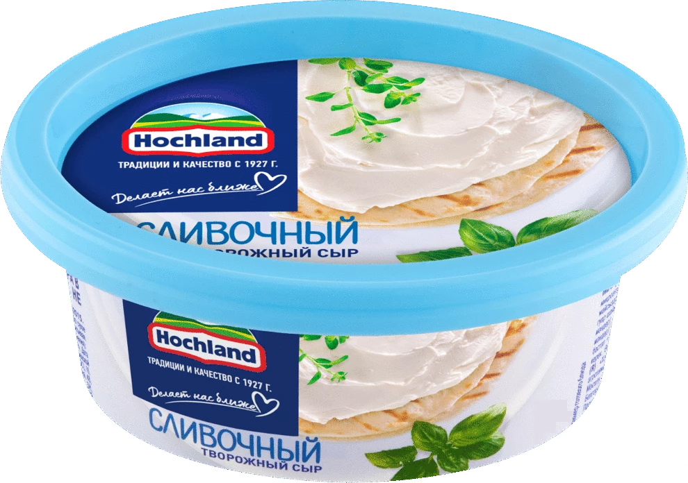 Сыр творожный сливочный "Hochland" (Россия) 60% жирности. Упаковка - пластиковая баночка 140 г.
