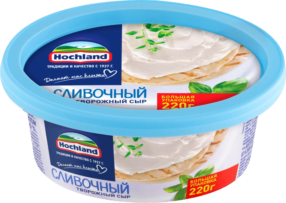 Сыр творожный сливочный "Hochland" (Россия) 60% жирности. Упаковка - пластиковая баночка 220 г.