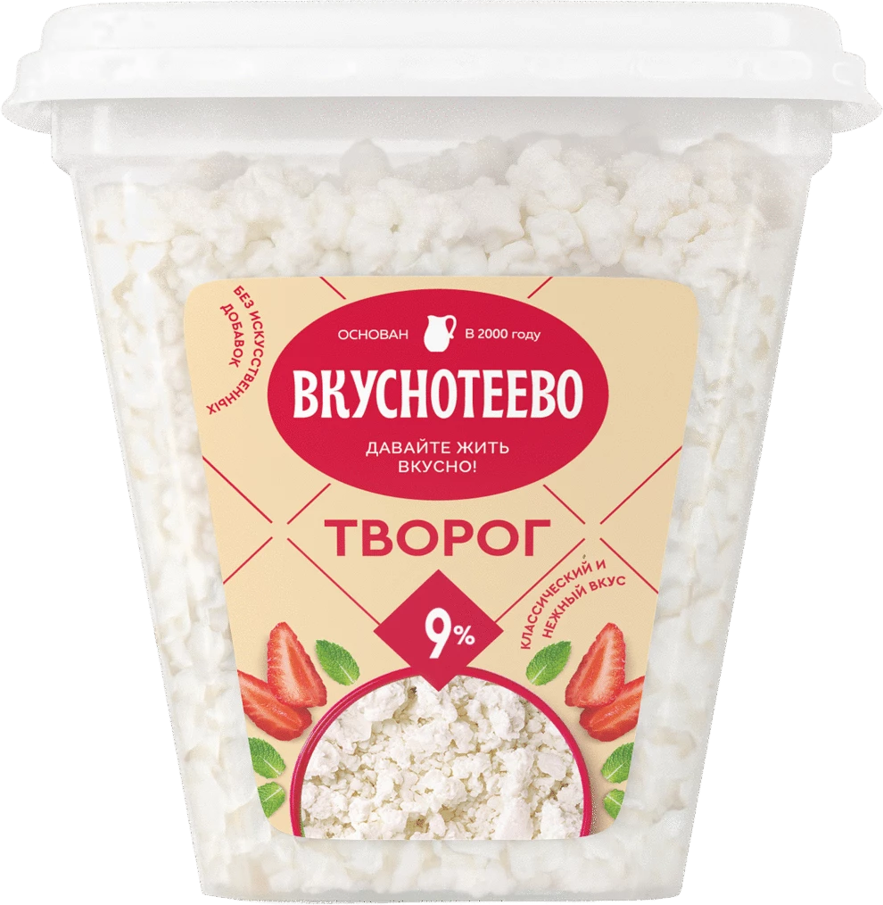 Творог "Вкуснотеево" 9% жирности. Упаковка - пластиковая ванночка 300 г.