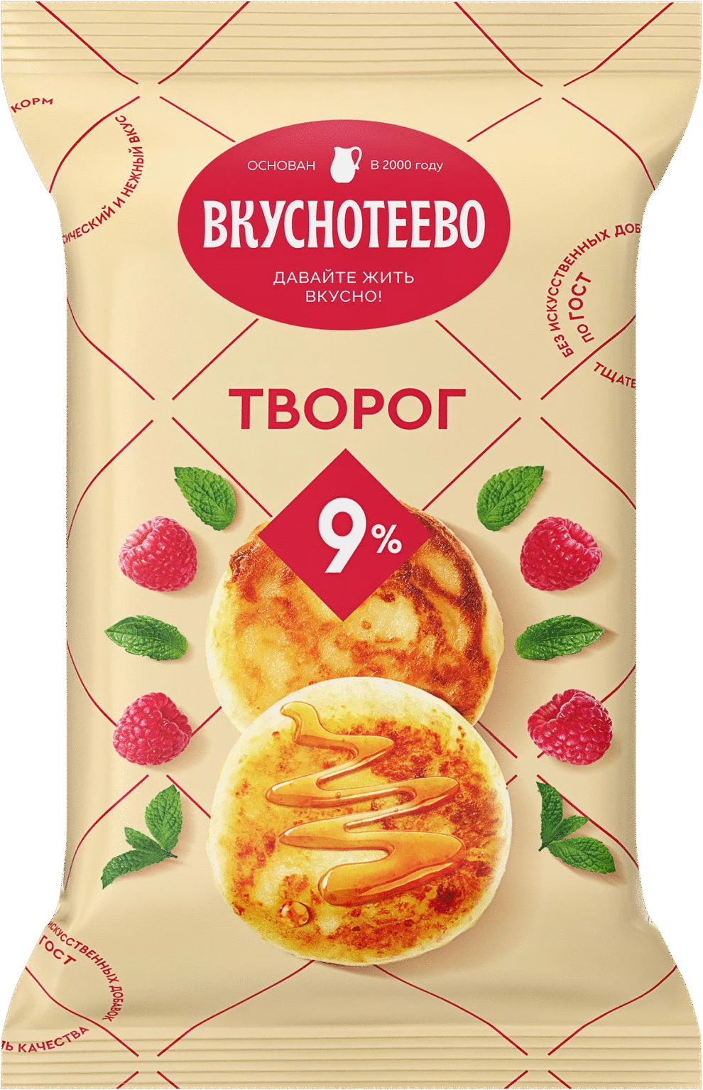 Творог "Вкуснотеево" 9% жирности. Упаковка - бумажный пакет 350 г.