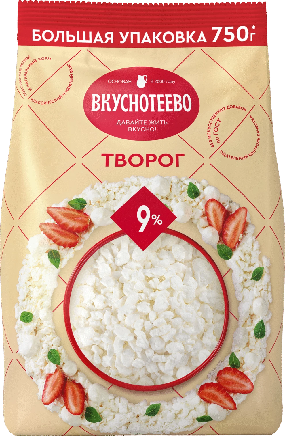 Творог "Вкуснотеево" 9% жирности. Упаковка - бумажный пакет 750 г.
