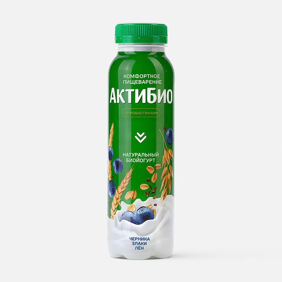 Йогурт питьевой "Актибио" черника, 5 злаков 1,6% жирности (Россия). Упаковка - пластиковая бутылка 260 г.