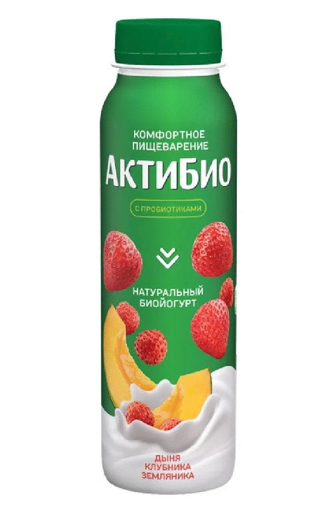Йогурт питьевой "Актибио" дыня, клубника, земляника 1,5% жирности (Россия). Упаковка - пластиковая бутылка 260 г.